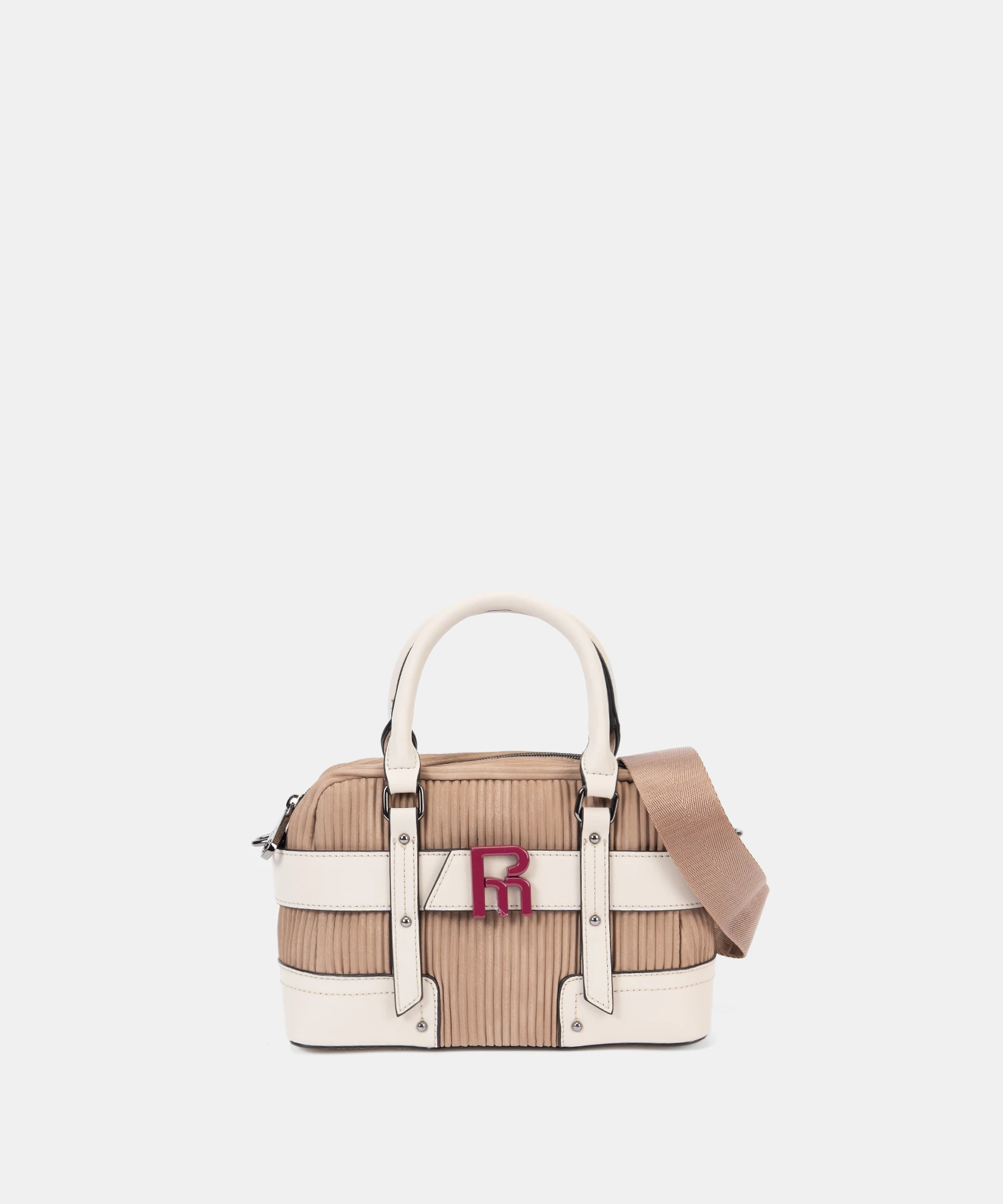 El gran logo metálico frontal en forma de “R” refuerza el carácter del bolso, junto con los herrajes brillantes que completan su diseño con un toque moderno.