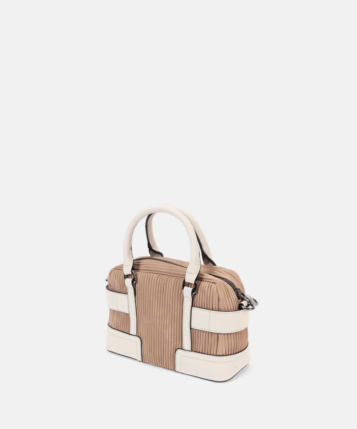 Las asas cortas permiten llevarlo cómodamente en la mano, mientras que su correa larga ajustable y extraíble añade un plus de versatilidad para transformarlo en bolso de hombro o bandolera según el momento. La textura del cuerpo, con patrón vertical en relieve, se combina con detalles lisos en contraste que aportan estilo y presencia.