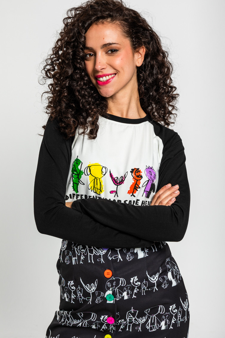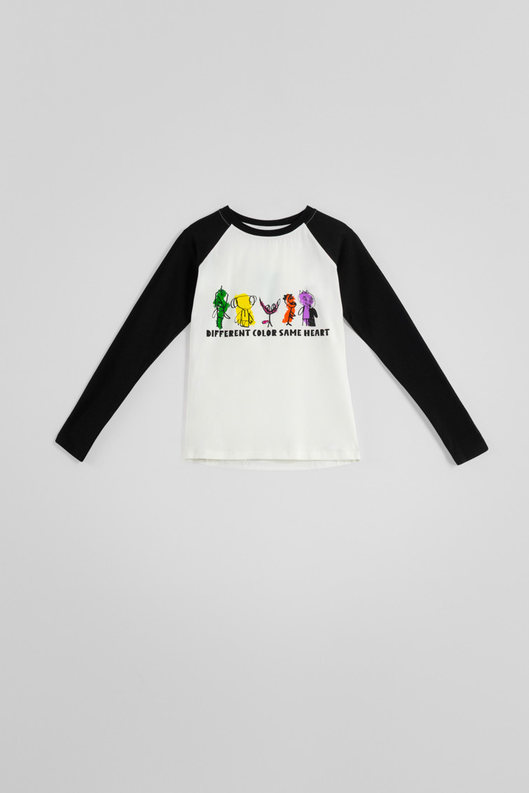 Confeccionada en algodón con elastán, presenta un diseño moderno y juvenil: base blanca con mangas largas en color negro de contraste, ribete de canalé en el cuello y un print posicional exclusivo en el frontal.