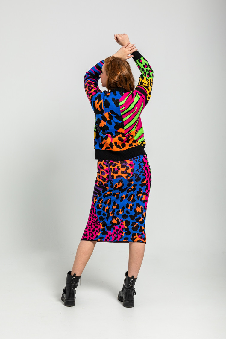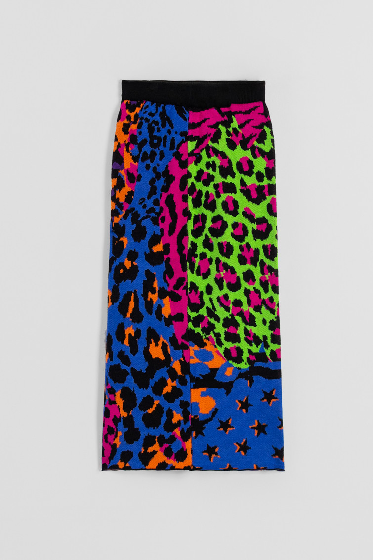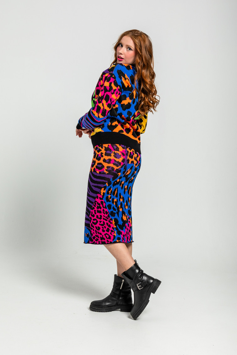 Falda Punto Tejido: Falda de punto tejido con estampado animal print variado y colorido.