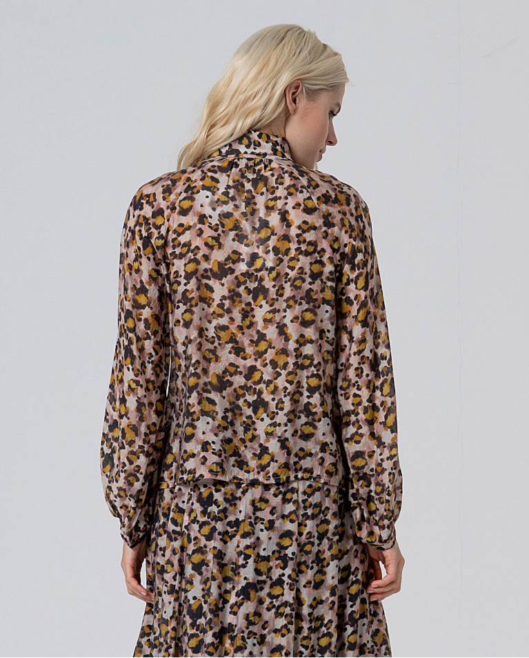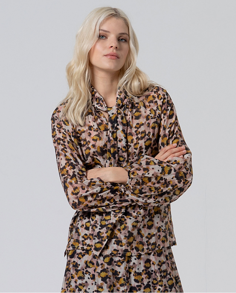 Blusa fluida estampado animal print de viscosa con cuello lazada y puños fruncidos.