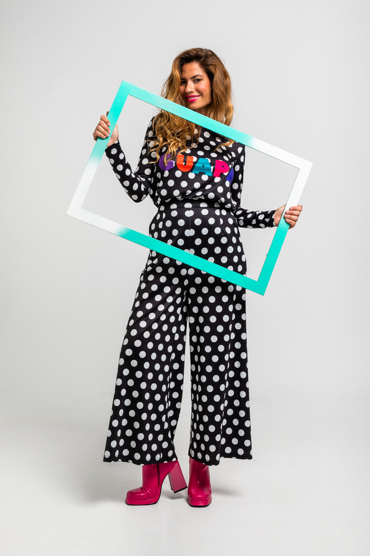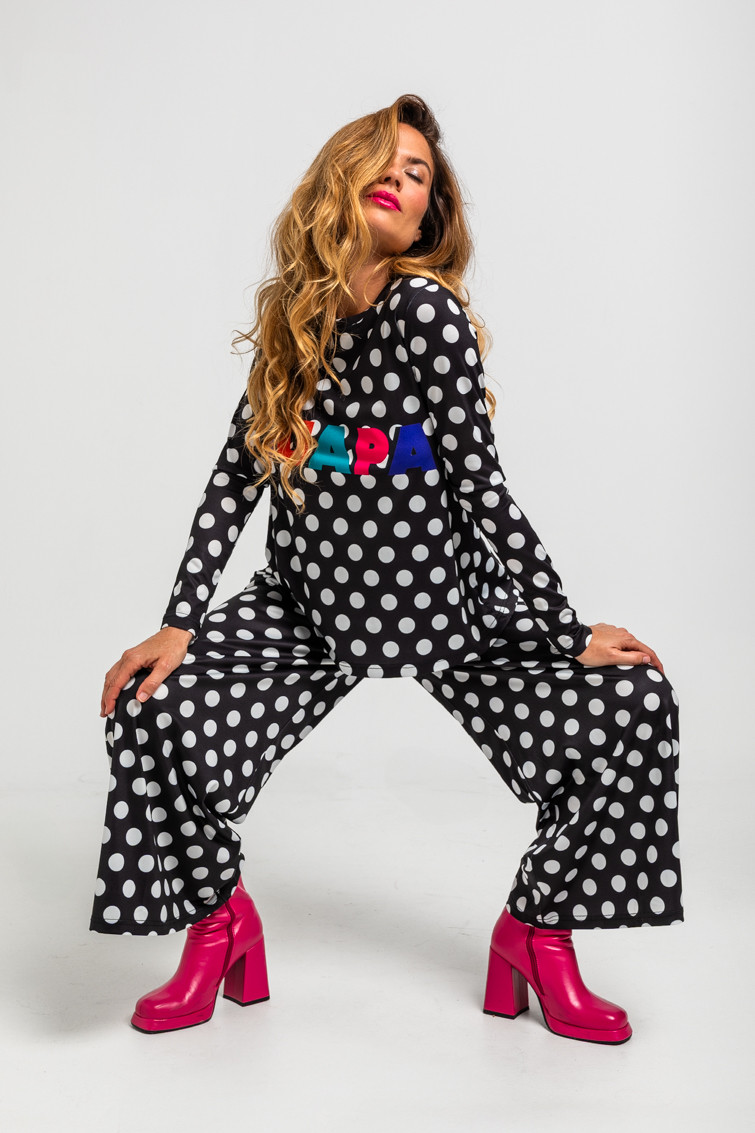Confeccionada en un tejido elástico de poliéster con elastán, presenta un corte acampanado que estiliza la figura, manga larga y cuello redondo con print posicional de la colección. Su estampado vectorial de topos en blanco y negro aporta un toque atemporal y versátil que podrás combinar fácilmente con jeans, pantalones o faldas.
