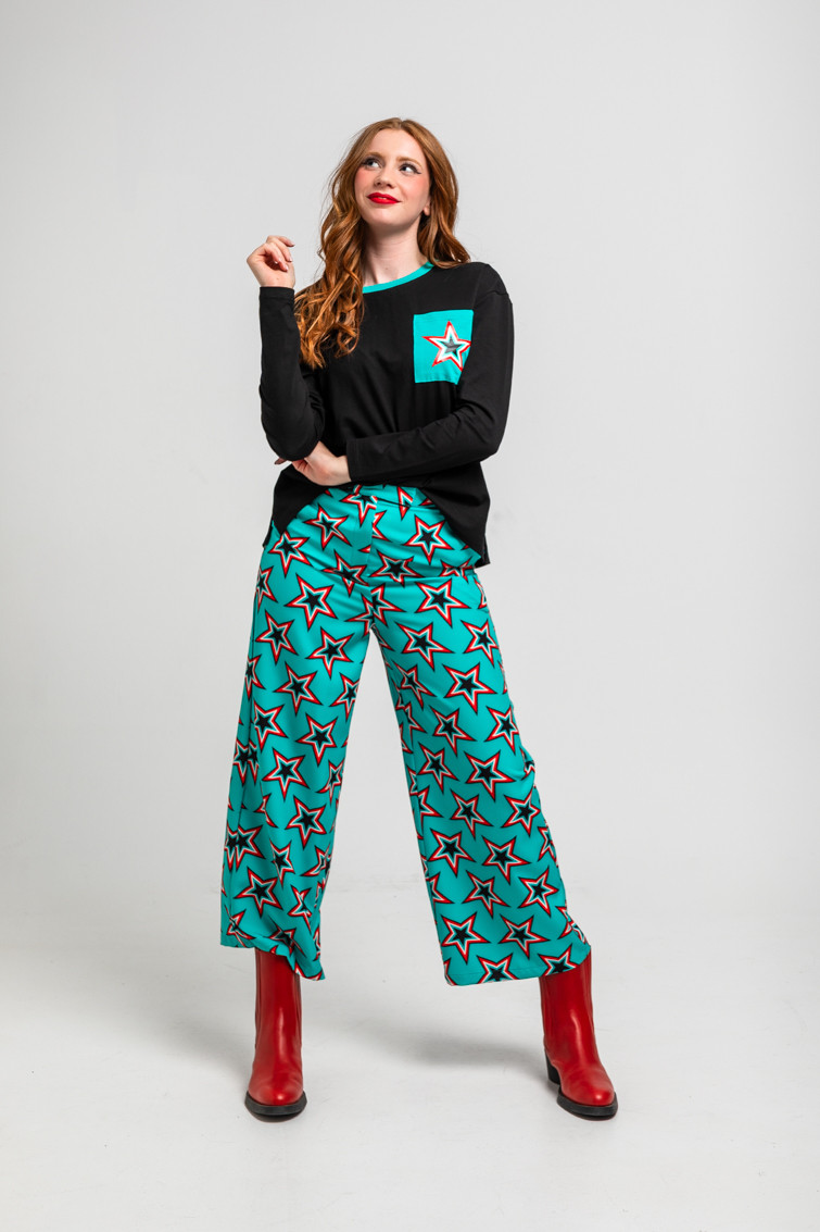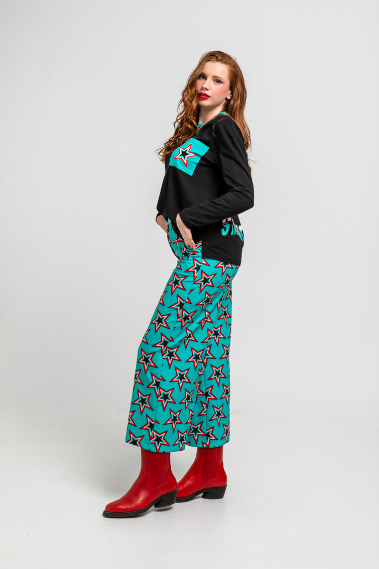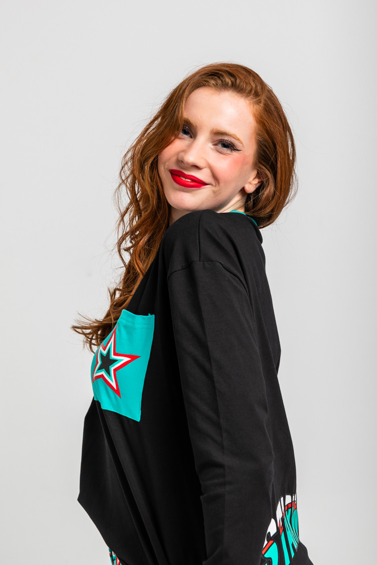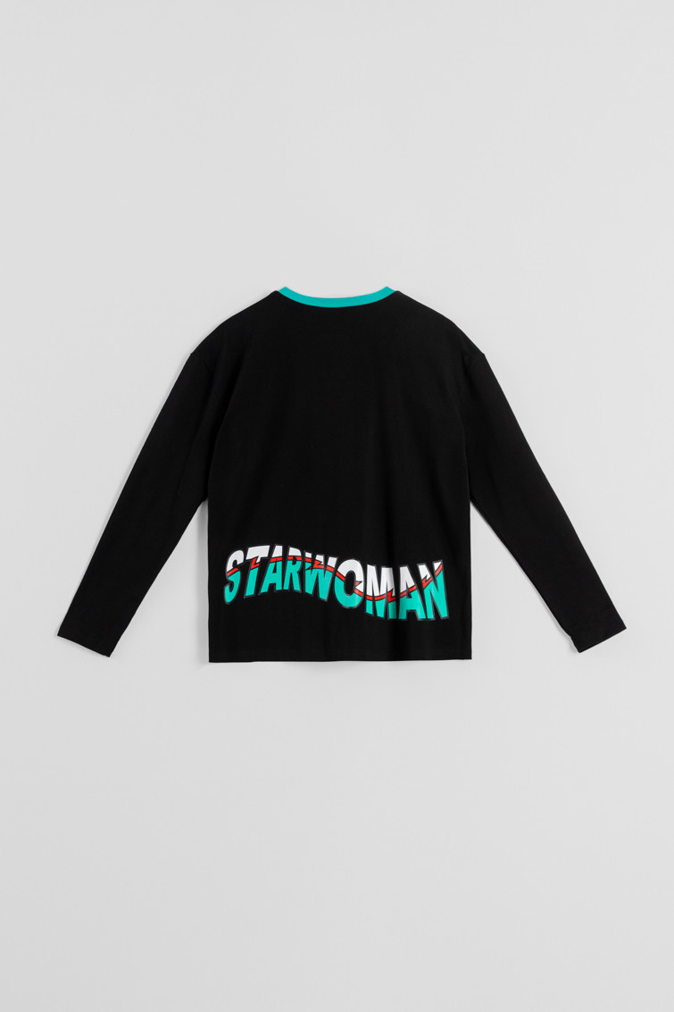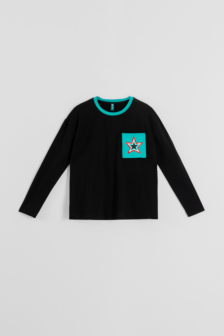 Camiseta oversize negra de algodón y elastano de corte cuadrado, manga larga y hombro caído, posicional en el pecho y cortes laterales. Cuello redondo a contraste. Detalle de bolsillo lateral en la parte frontal con estrella. Print en la parte baja trasera.