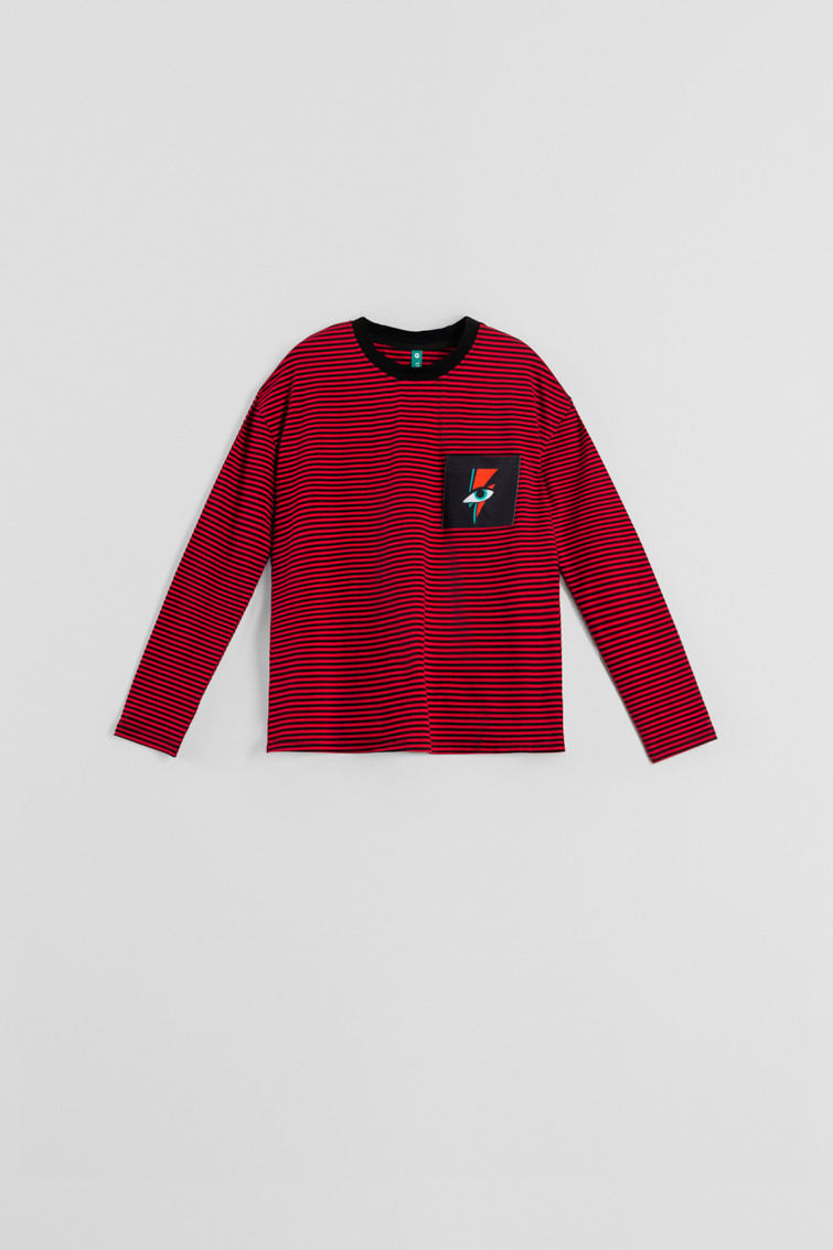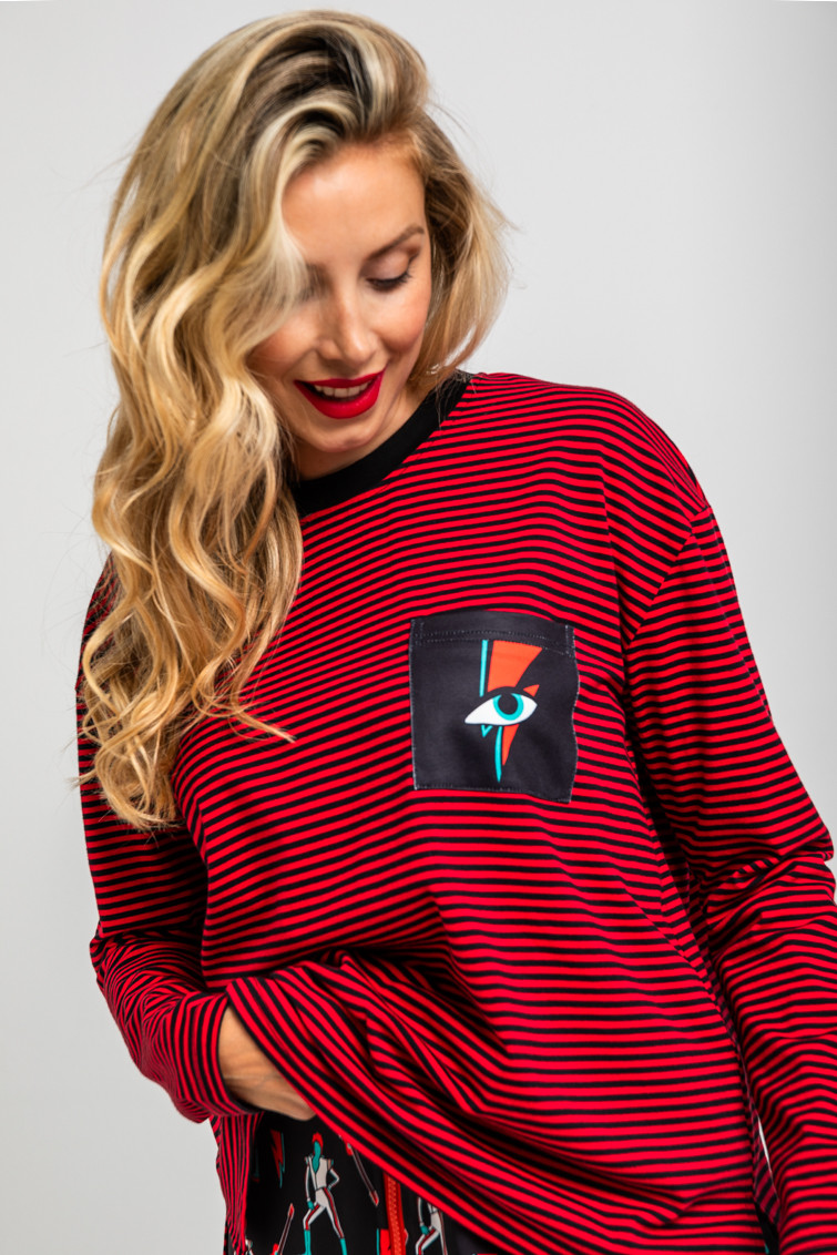 Camiseta confeccionada en algodón y elastano en rayas rojas y negras. Cuello redondo color negro. Detalle de bolsillo negro con un ojo y un rayo en un lateral de la parte frontal.