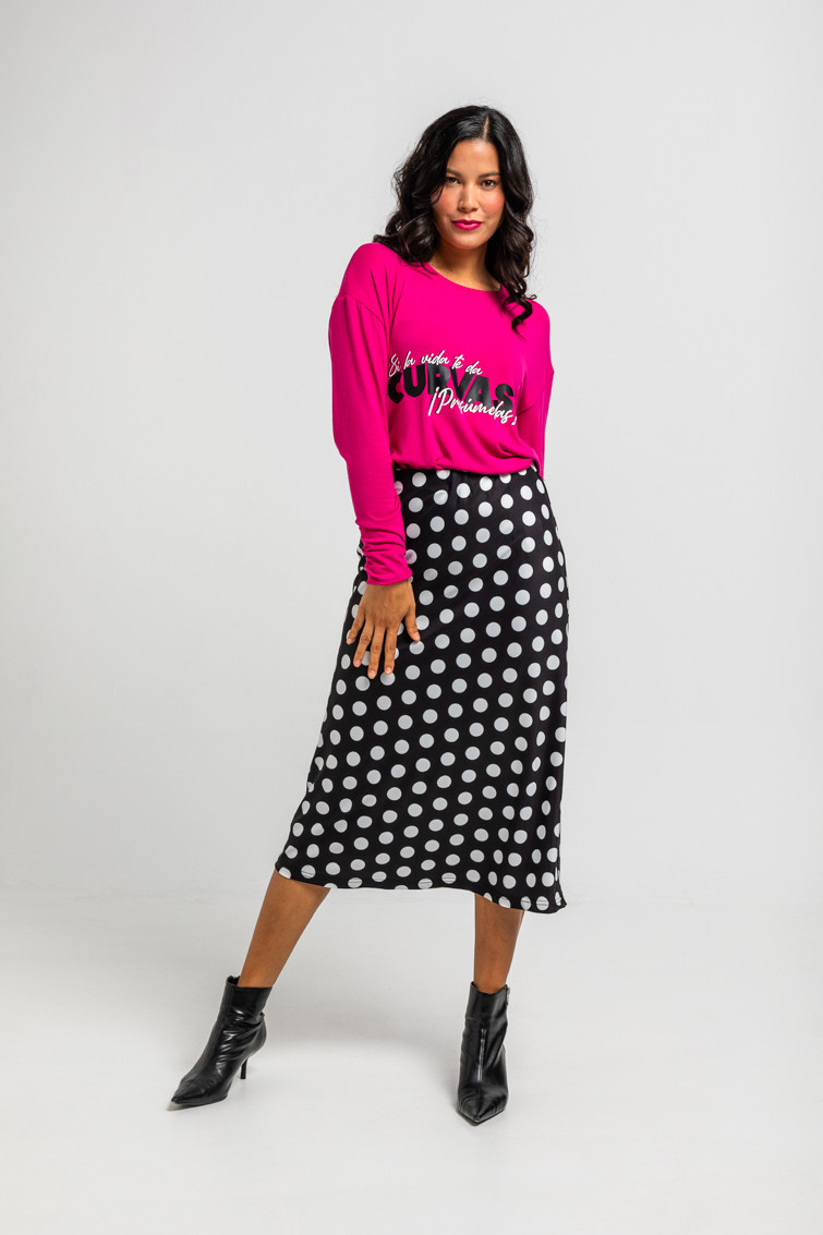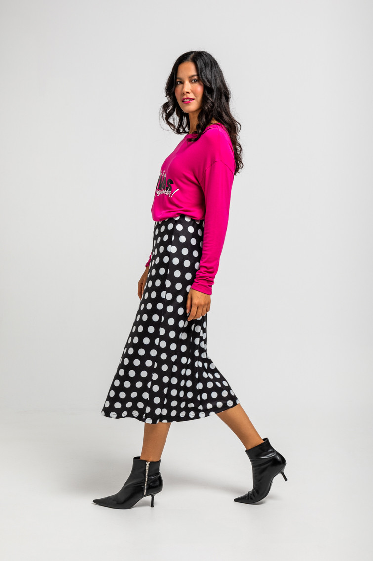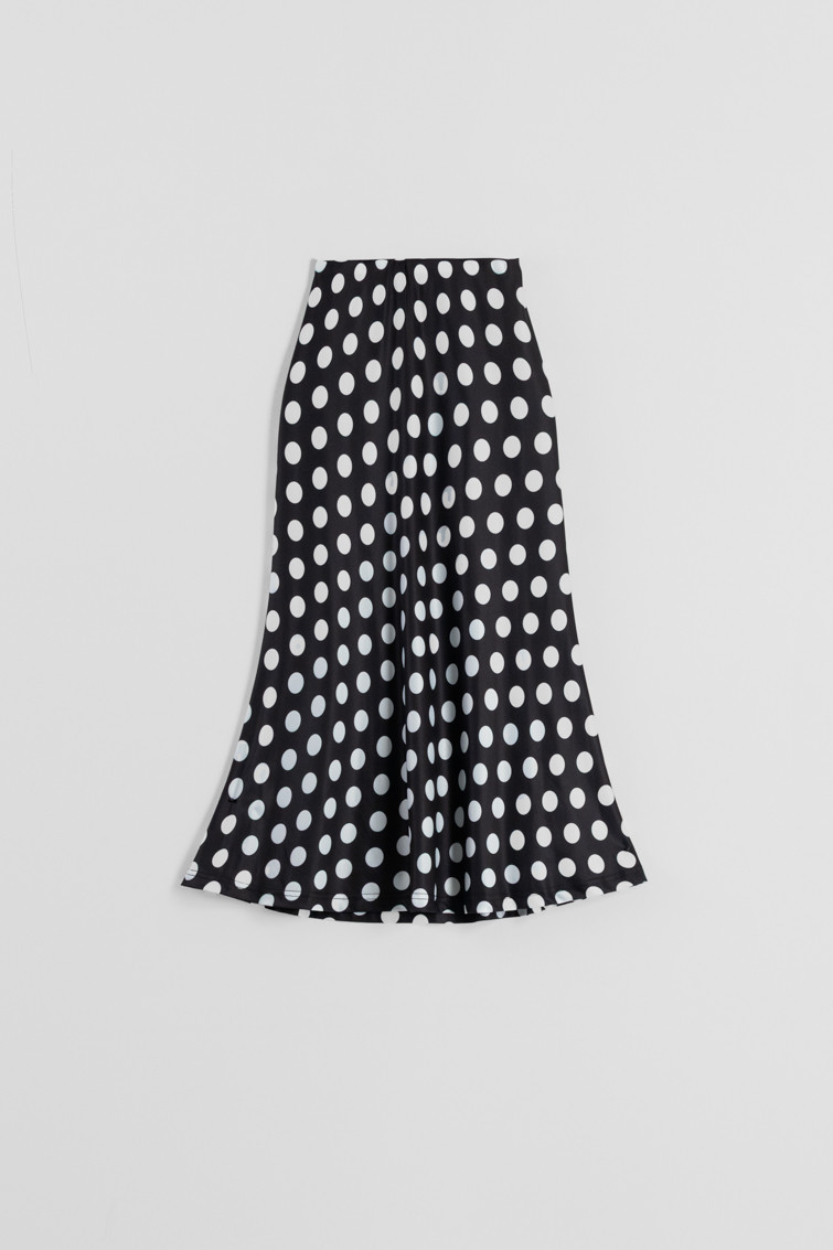 Falda evasé midi monocromática topos blanco sobre fondo negro: Falda midi de tejido fluido. Modelo con elástico oculto en la cintura y ligero vuelo en el bajo.