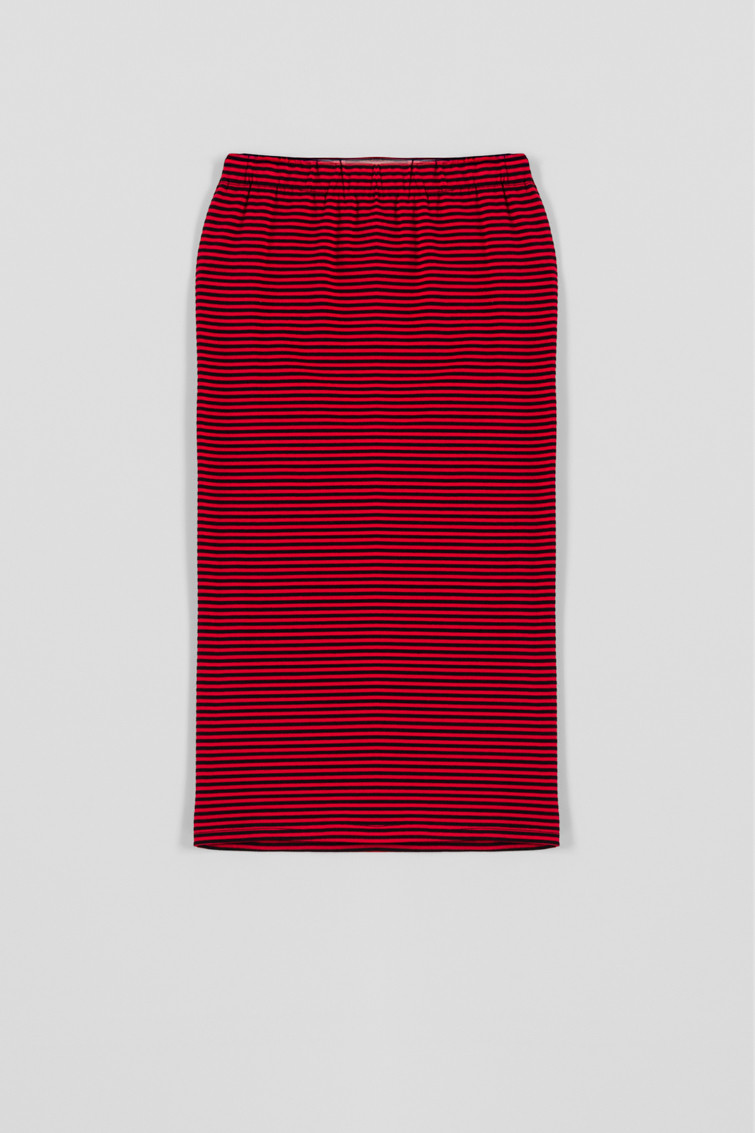 Falda Midi Elástica: Falda larga de tejido fluido elástica de rayas rojas y negras, corte recto y abertura trasera.