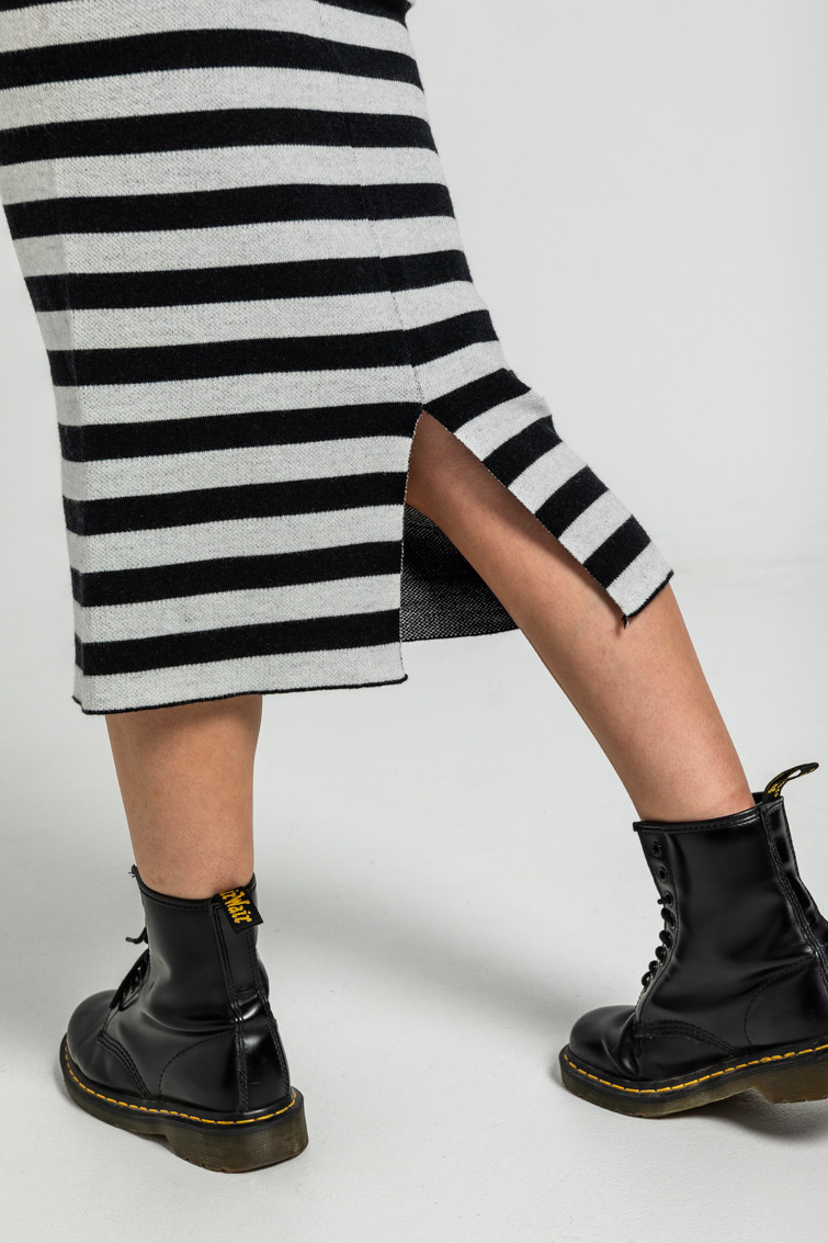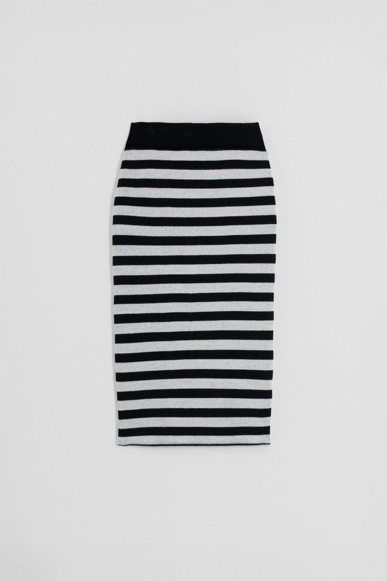 Falda Punto Tejido: Falda de punto con tejido de rayas blanco y negro con abertura en la parte trasera.