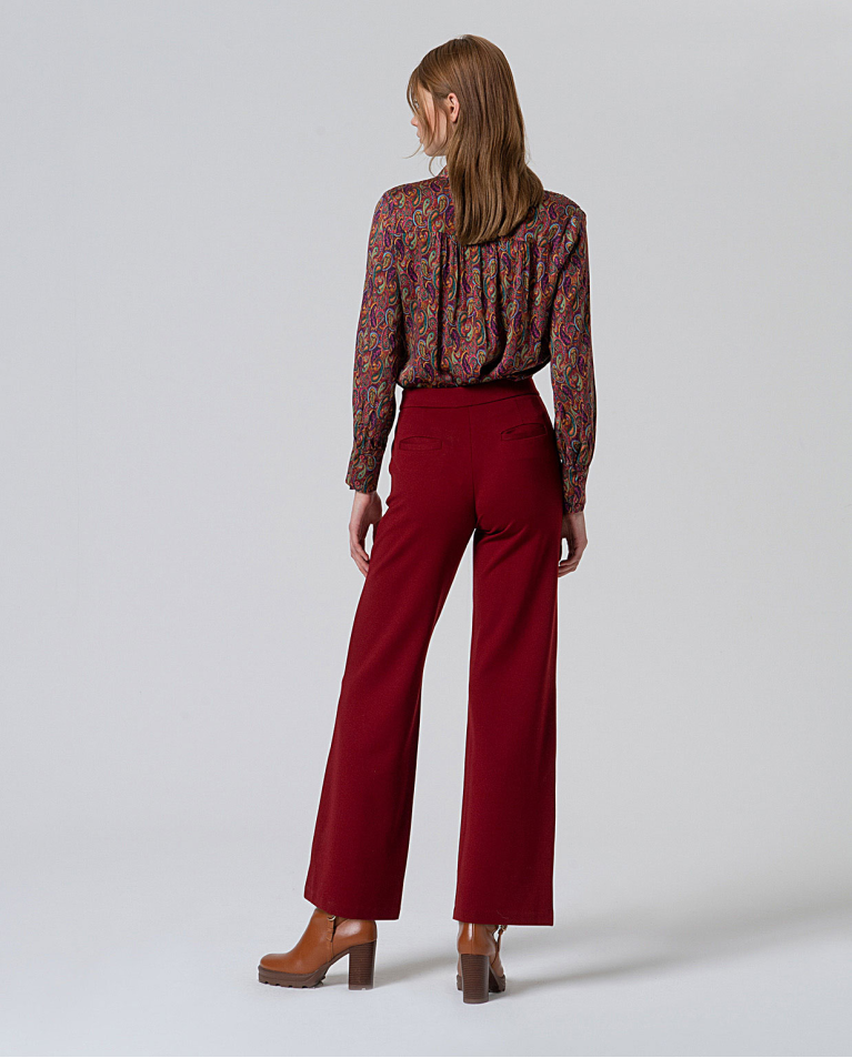 Pantalón recto color rojo inglés sin cierres, con bolsillos y detalle de botón decorativo en la cintura que imita un cinturón. Lleva bolsillos laterales.