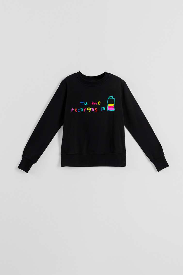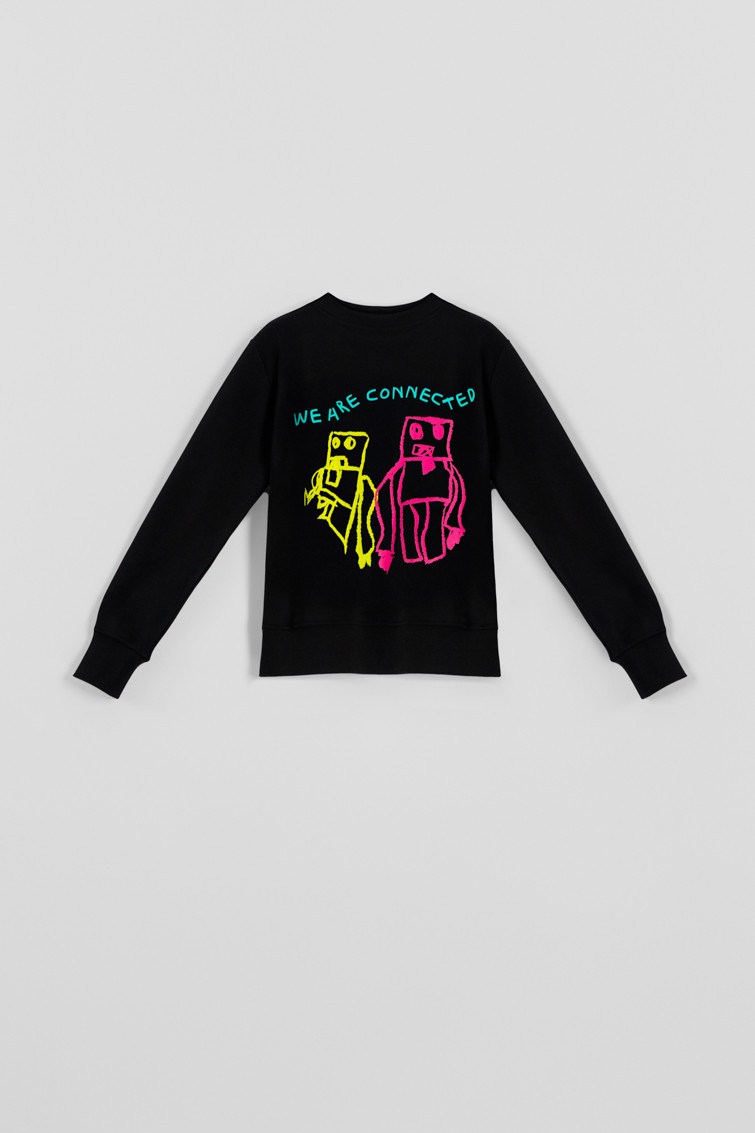 Este robotito es obra de uno de los maravillosos niños del centro de acogida de Granada al que irán destinados parte de los beneficios de esta colección. – Sudadera Sencilla color negro: Sudadera en mezcla de algodón con ilustración estampada en el frontal y print robots en la espalda. Modelo de corte relajado con hombros caídos y cuello, puños y bajo en canalé. Interior toalla.