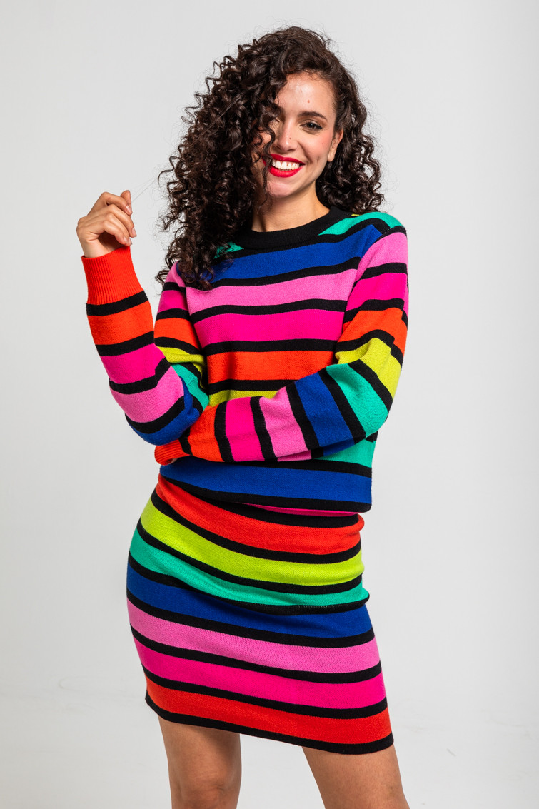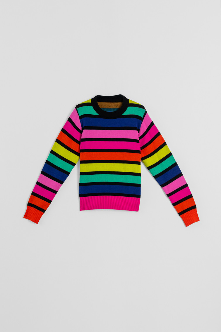 Suéter ajustado: Jersey ligeramente largo en punto fino de lana suave confeccionado con rayas multicolor. Modelo ajustado con cuello redondo ribeteado en canalé color negro en cuello y rojo en puños.