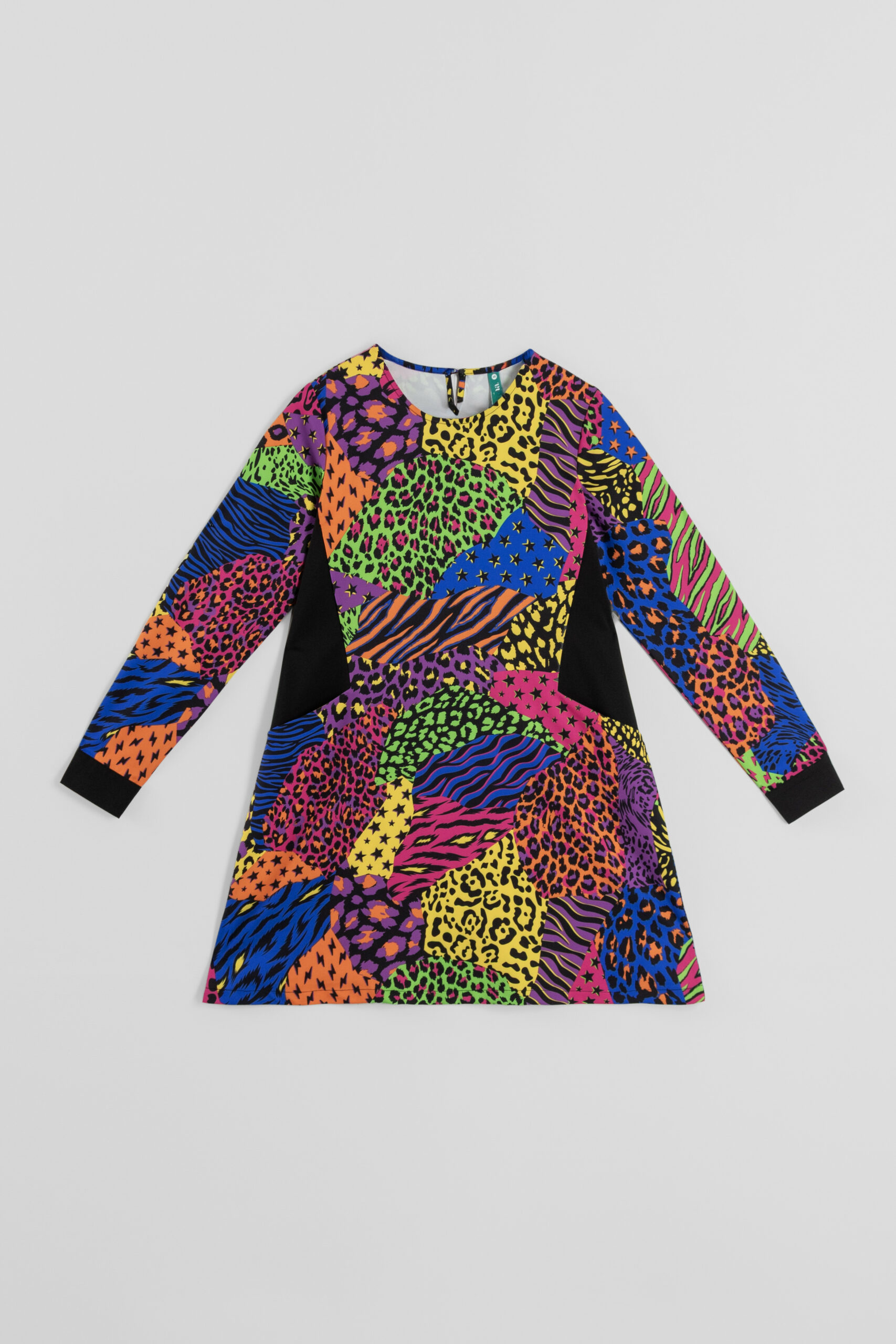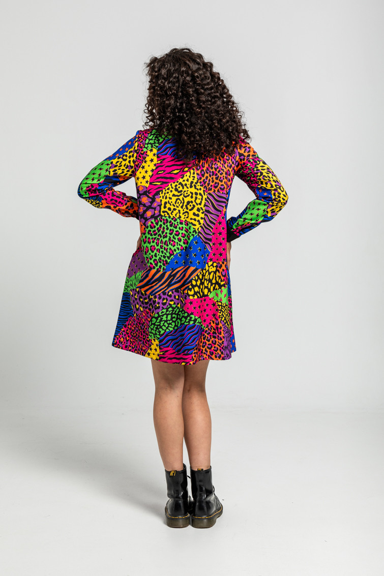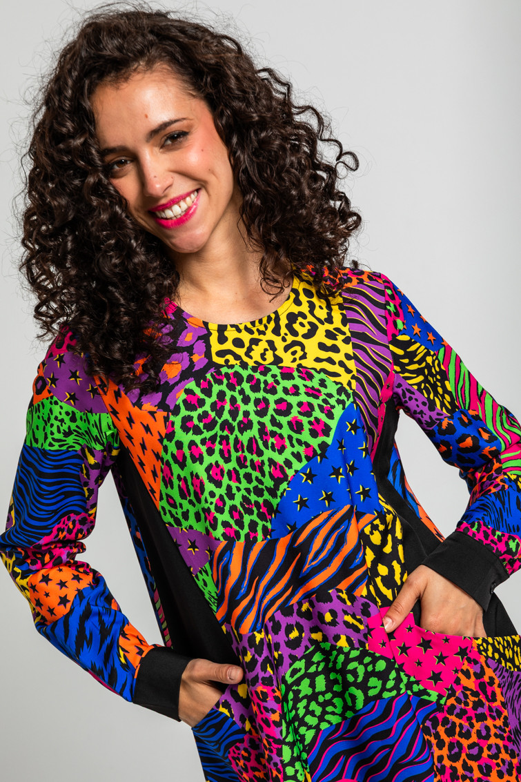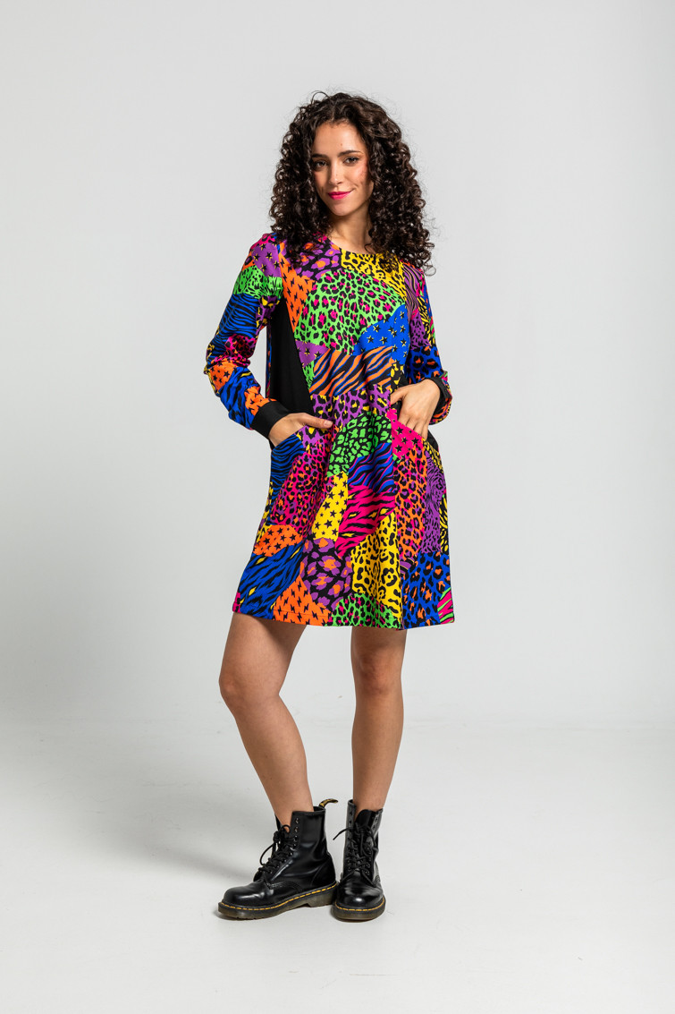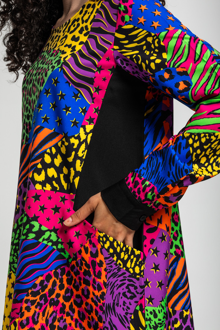 Vestido Corte A con bolsillos en los laterales y estampado variado de animal print: Vestido de manga larga con bolsillos y cuello redondo de tejido fluido con cuerpo. Corte A y costadillos patchwork a contraste. Cierre en espalda con botón.