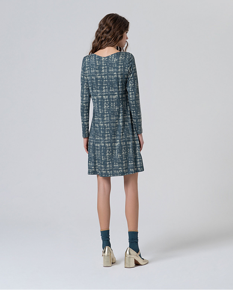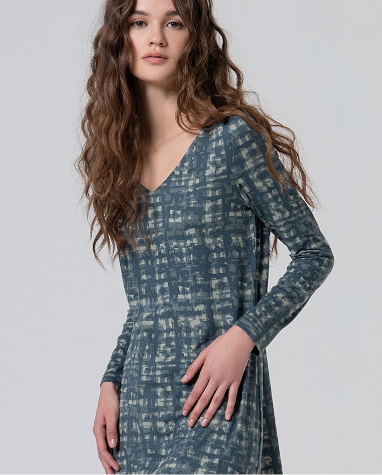 Vestido corto SURKANA de viscosa reciclada con escote pico y corte entallado en la cintura. El estampado de pinceladas abstractas color azul acero aporta dinamismo a una silueta femenina y cómoda. Una prenda perfecta para un look casual con estilo.