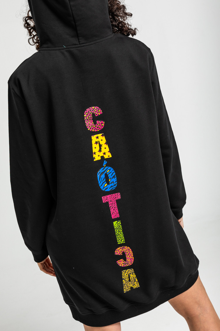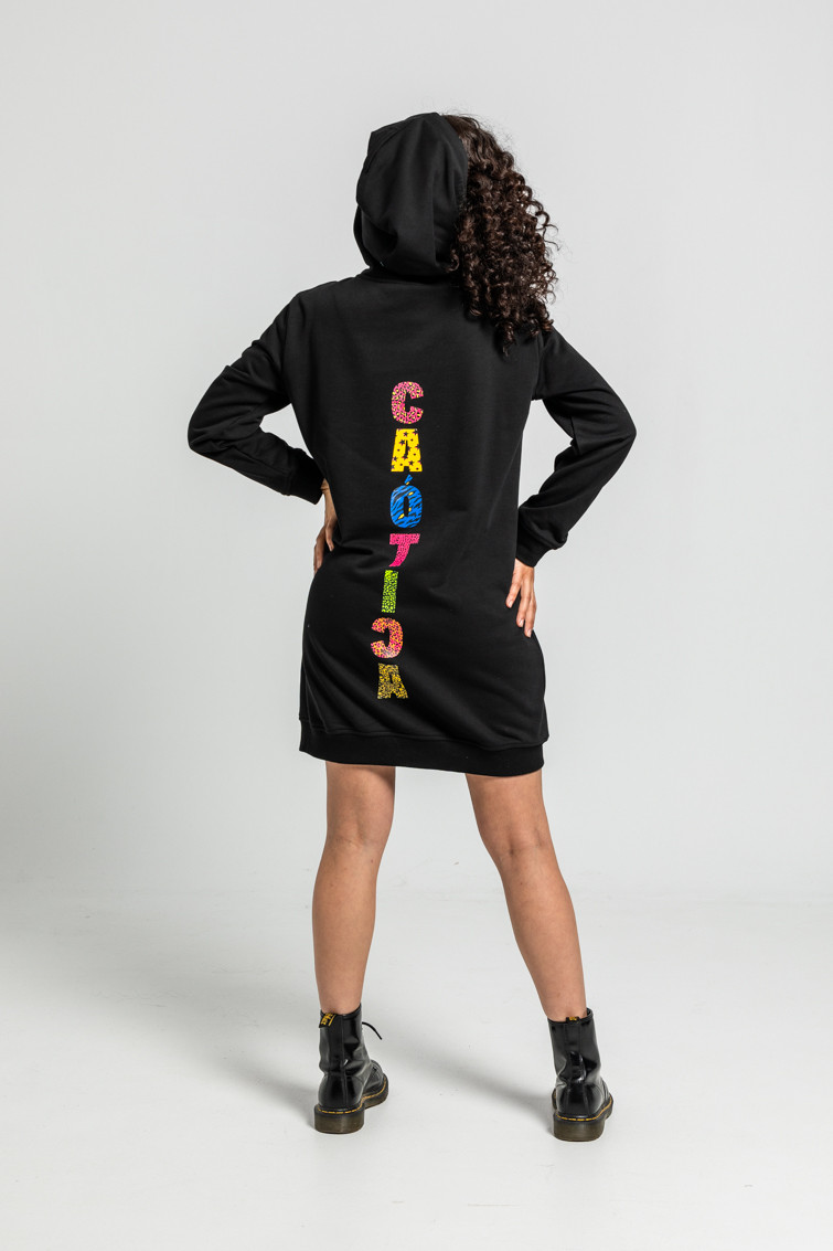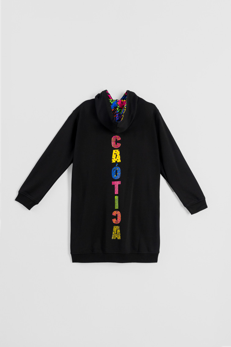 Vestido Sudadera: Vestido sudadera modelo canguro en tejido suave color negro y bolsillo central animal print variado de mezcla de algodón. Modelo con capucha forrada con print y con cordón de ajuste, hombros caídos. Estampado posicional en la espalda con las palabras CAÓTICA. Puños y bajo en punto elástico de canalé.